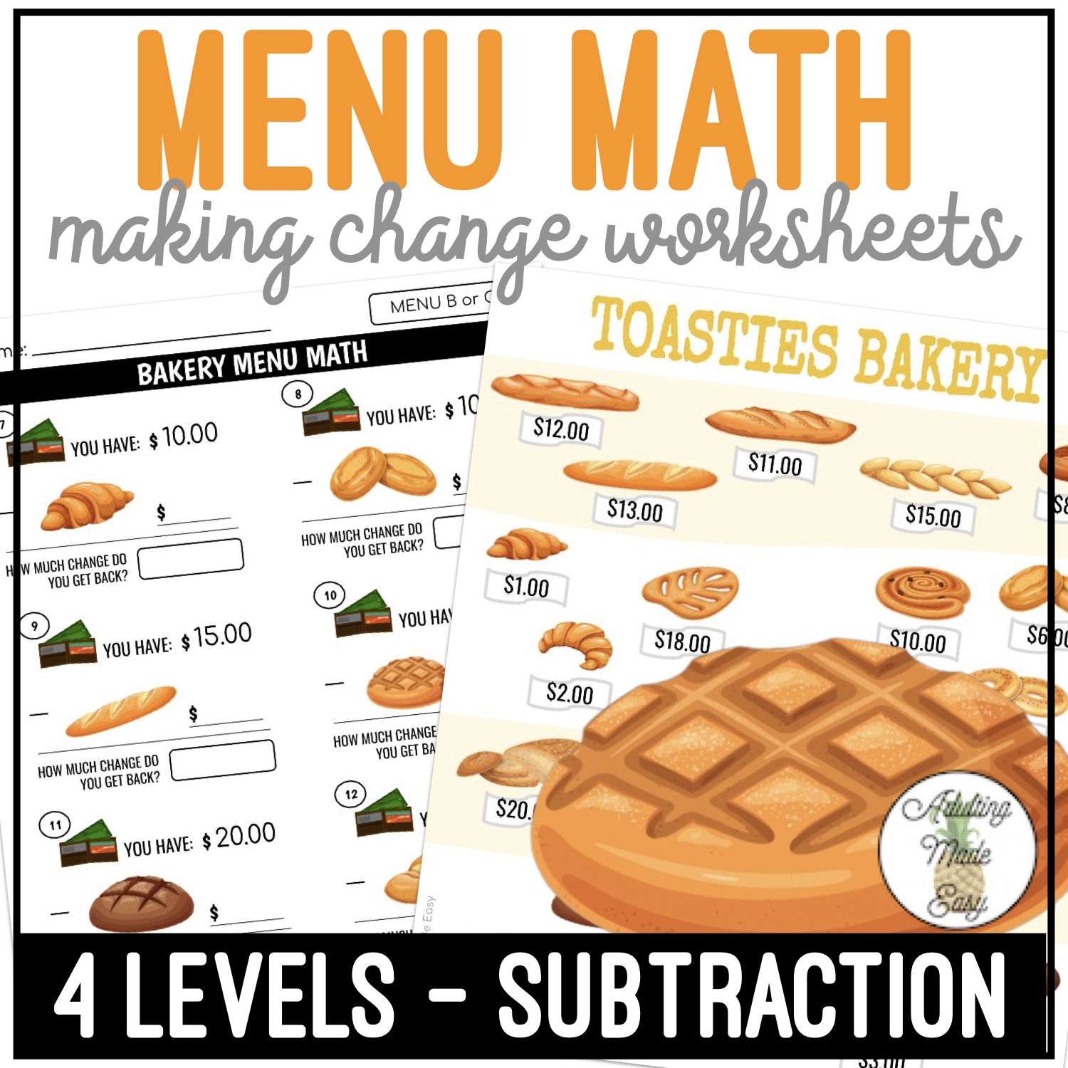 Bakery Menu Math Making Change Subtraction Worksheets